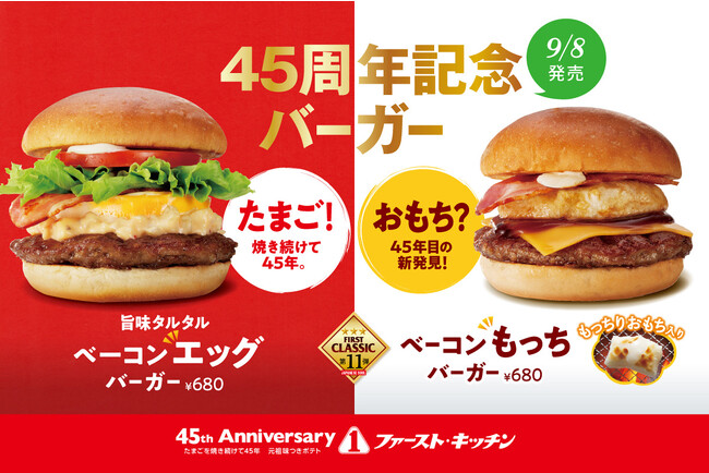 ファーストキッチン株式会社(代表取締役:紫関修 所在地:東京都新宿区)では、9月8日(木)より、ファーストキッチン(一部店舗を除く)にて、たまごを焼き続けて45年!! 創業45周年を記念し、創業以来の大看板メニュー「ベーコンエッグバーガー」にフォーカスした商品を2種発売します。