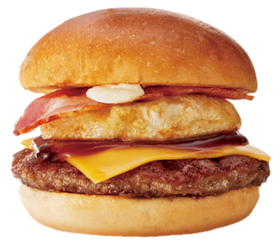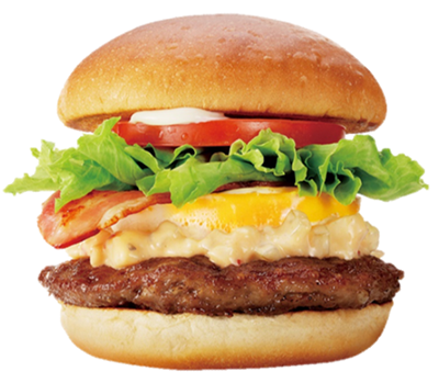 たまごを焼き続けたからこそたどり着いた新発見!!このまま焼き続けて良いのか!?自問自答の末生み出された究極の至高商品 「ベーコン”もっち”バーガー」是非ご堪能ください。
