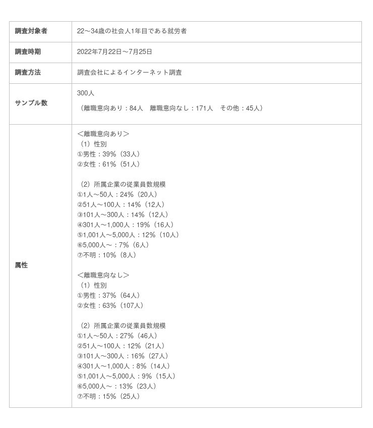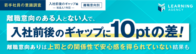 累計13,000社350万人以上の組織開発と人材開発を支援し、革新的なサービスを提供(複数の業界初のサービスを開発)し続けている株式会社ラーニングエージェンシー(旧トーマツ イノベーション株式会社、本社 東京都千代田区、代表取締役社長 眞崎大輔)および人と組織の未来創りに関する調査・研究を行うラーニングイノベーション総合研究所では、社会人1年目の300人に対し、2022年7月に入社前後のギャップに関する意識調査を行いました。今回は、離職意向の有無についての属性*1で分析した調査結果を公表いたします。