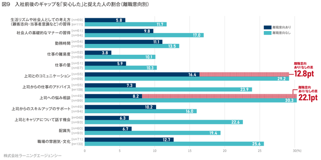 最後に、離職意向がある新人と、ない新人が回答した10の感情の割合の差を比較し、最も大きな差に焦点を当てました。最も差があった項目は『安心』であり、11のギャップ項目の中の「上司への悩み相談」において最大の差が出ました。離職意向のある人はわずか8.2%となりましたが、離職意向のない人は30.3%も回答し、離職の有無で22.1ptも差がありました。(図9)