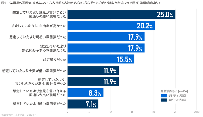 続いて、離職意向のある新人へ、11のギャップ項目以外にも職場の雰囲気・文化について入社前後でどのようなギャップがあったか複数選択で質問したところ、「想定していたより意見が言いづらい風通しの悪い職場だった」が最も高く25.0%となりました。2位以降は「想定したより、自由度が高かった(20.2%)」、「想定していたより明るい雰囲気だった(17.9%)」、「想定していたより熱気にあふれる雰囲気だった(17.9%)」が続く結果となり、職場の雰囲気・文化については、ネガティブなギャップだけではなく、ポジティブなギャップも感じている結果となりました。(図4)