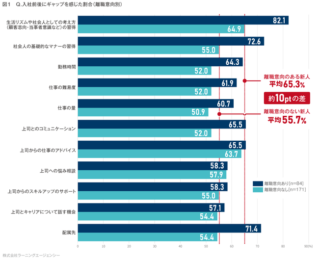 結果、離職意向のある新人で最もギャップを感じた項目は、「生活リズムや社会人としての考え方(顧客志向・当事者意識など)の習得(82.1%)」となりました。次に、「社会人の基礎的なマナーの習得(72.6%)」、「配属先(71.4%)」と続く結果でした。