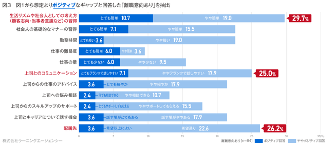 *3 各ギャップ項目に対し、想定よりも簡単、勤務時間が短い、仕事量が少ない、上司と話しやすい、アドバイスが細やか、相談しやすい、サポートがあるといった回答層をポジティブと設定