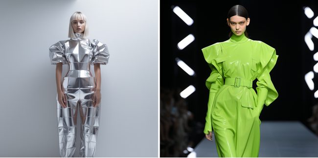 光を反射するメタリック素材が印象的な、未来を感じさせるデザインです。膨らんだ袖が大胆なシルエットを演出し、タイトなウエストラインと立体パネルが現代的なスタイルを強調しています。AIと人とのデザインが融合し、革新的なアイテムが生まれました。色違いで同じデザインながら違う印象を受けるブラックverも展開しています