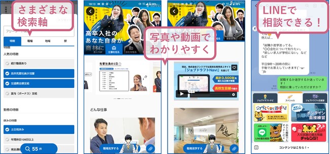 これまで文字情報のみだった高卒採用を行う企業の「求人票」の情報を、Webサイトやアプリに掲載した高校生のための求人情報メディアです。高校生は学校の進路指導室以外の場所で、スマートフォンなどからサイトやアプリを通じていつでも情報にアクセスすることができます。