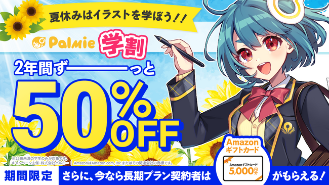 株式会社パルミー(所在地:東京都港区、代表取締役:大野英紀、以下パルミー)は、本日2024年8月9日(金)12時00分から2024年8月19日(月)18時59分までの期間、パルミーの受講料が初月50%OFFになるキャンペーンを開催いたします。また、学割長期プラン限定でAmazonギフトカード5,000円分をプレゼントする『学生応援キャンペーン』も開催中!お盆休みはパルミーでイラストを学びませんか?