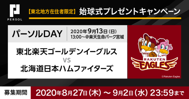 パ・リーグ公式スポンサーのパーソルグループとパ・リーグ6球団が日本全体に笑顔を届けていくために、パーソルグループの冠協賛試合「パーソルDAY」の始球式投球権プレゼントキャンペーンを実施しています。第2弾は東北地方にお住まいの方限定で、9月13日(日)に楽天生命パーク宮城で行われる「東北楽天ゴールデンイーグルス vs 北海道日本ハムファイターズ」の始球式投球権(2名様分の観戦チケット・直筆サイン入りユニフォーム付)を1名様にプレゼントします。さらにWチャンスとして、残念ながら始球式投球権が外れてしまった方でも、応募してくださった方の中から抽選で50組100名様に当日の観戦チケットをプレゼントします。たくさんのご応募をお待ちしています!