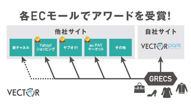 当社はオンライン宅配買取サービス 「フクウロ」 やリサイクルショップ「ベクトル」などで仕入れた古着ファッションアイテムを、独自のマルチチャネル出品システム「GRECS(グレックス)」を通じ、自社運営通販サイト「ベクトルパーク」だけでなく、「ヤフオク!」や「Yahoo!ショッピング」などのECモールでも販売しております。当社は今後も、自社運営通販サイトに留まらず、連携する様々なチャネルのサイト上のファッションアイテムを充実させることで、サービスを利用するユーザー数の拡大および顧客満足の向上を目指します。