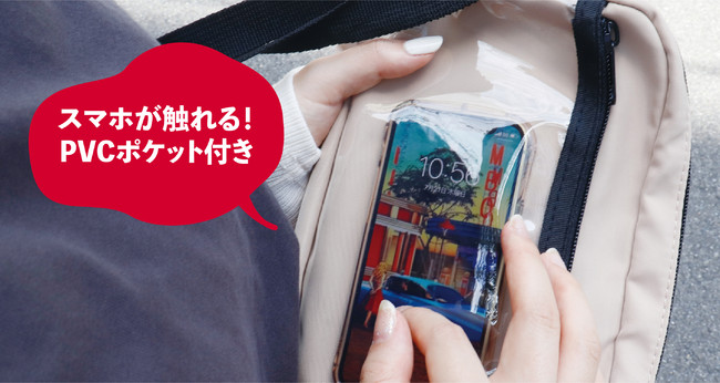 背面のPVCポケットは入れたままスマホが触れるのでお出かけやレジャーシーンで活躍します。