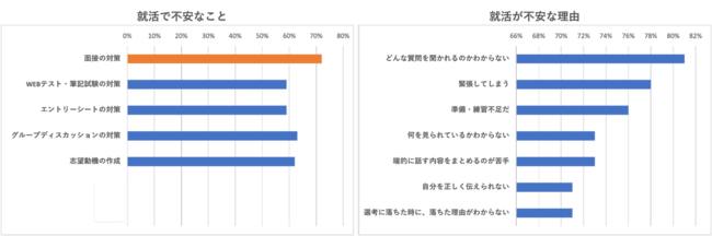 例年と比べ、課外活動において先輩から就活体験談を聞く機会も減少したため、就職活動に対する不安感が高まっていると考えられます。中でも「面接」に関しては学生と企業間においてのみ行われる密室でのコミュニケーションであるため、その内容や雰囲気について知ることは困難です。実際、「面接が不安な理由」として「どんな質問が来るのかわからない」「何を見られているかわからない」「選考に落ちたとき、落ちた理由がわからない」等が多く挙げられています。