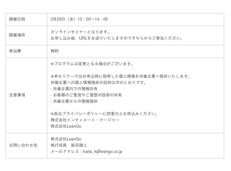 株式会社LeanGo(本社:東京都目黒区、代表取締役:平井 翔吏)は、株式会社インティメート・マージャー(本社:東京都港区、代表取締役社長:簗島 亮次)と3月29日(水) 13:00〜14:00に無料オンラインセミナーを開催いたします。