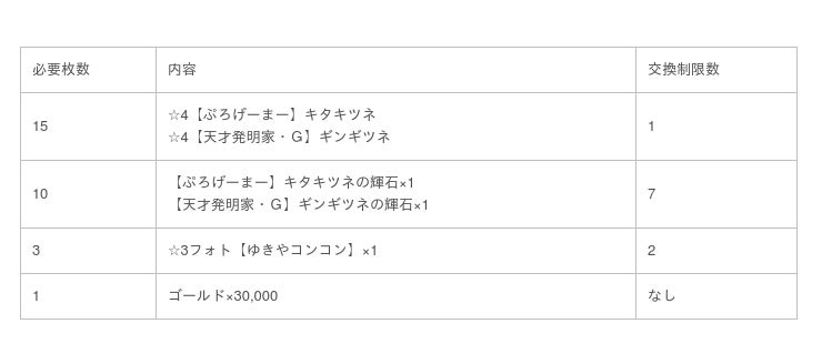 また「10回しょうたい」するごとに、「クリスマスすぺしゃるショップしょうたい券」×1に加え、ジャパまん(オール)大、あるいはキラキラ(無償)が獲得できる「クリスマスらっきーボックス」がもらえます。「クリスマスすぺしゃるショップしょうたい券」を一定数集めると、「クリスマスすぺしゃるショップしょうたい」で☆4「【ぷろげーまー】キタキツネ」、☆4「【天才発明家・G】ギンギツネ」や、☆3フォト【ゆきやコンコン】と交換することができます。
