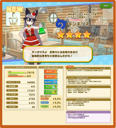※表示されているステータスは「Lv.」「なかよしLv.」「野生解放」「けものミラクル」「フォトポケ」が強化された状態です。入手時はLv.1および未強化の状態になります。