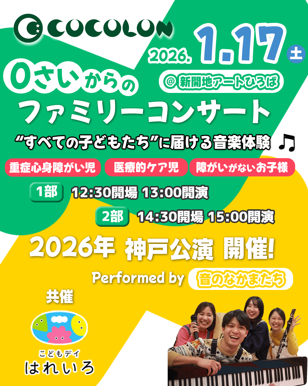 関西初開催|COCOLONイベント2025年1月17日に神戸・新開地で開催する「0さいからのファミリーコンサート」はCOCOLONが初めて関西で開催するイベントです。