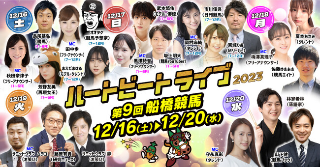 船橋ケイバでは、令和5年度第9回開催を12月16日(土)〜12月20日(水)に開催いたします。今開催は、準重賞レース「クイーンズオーディション」〔12月19日(火)〕、準重賞レース「ハートビートカップ」〔12月20日(水)〕が開催されるだけでなく、クリスマスにちなんだイベントが盛りだくさん!