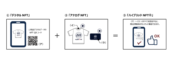 「ハイブリッドNFTマーケットプレイス(R)」とは、マーケットプレイス上で物理的商品(=「アナログ財」)を購入すると、当該商品の「デジタルNFT」が自動的に付与され、「真贋証明」および 「サプライチェーン(トレーサビリティ)」を100%担保した状態で、お手元に物理的商品が届くという全く新しい形式のショッピングモールです。