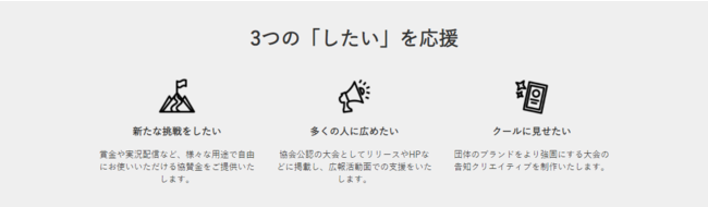 など、大会開催経験がない方も、大会開催経験が豊富な方も大会の開催における新たな挑戦について、協賛金や運営のサポート・企画相談などを通じて全面的にサポートいたします。