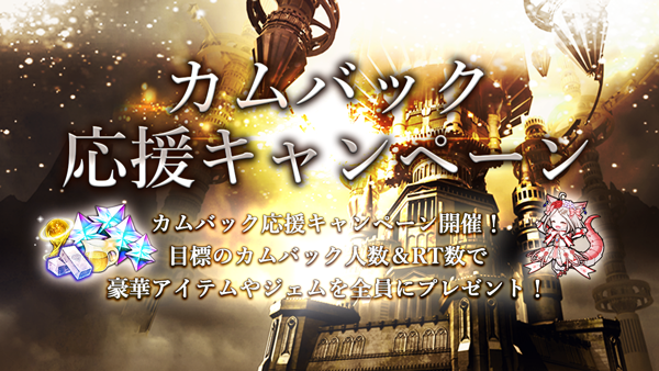カムバック数とリツイート数が目標値に達すると全ユーザーに豪華アイテムやジェムをプレゼント!