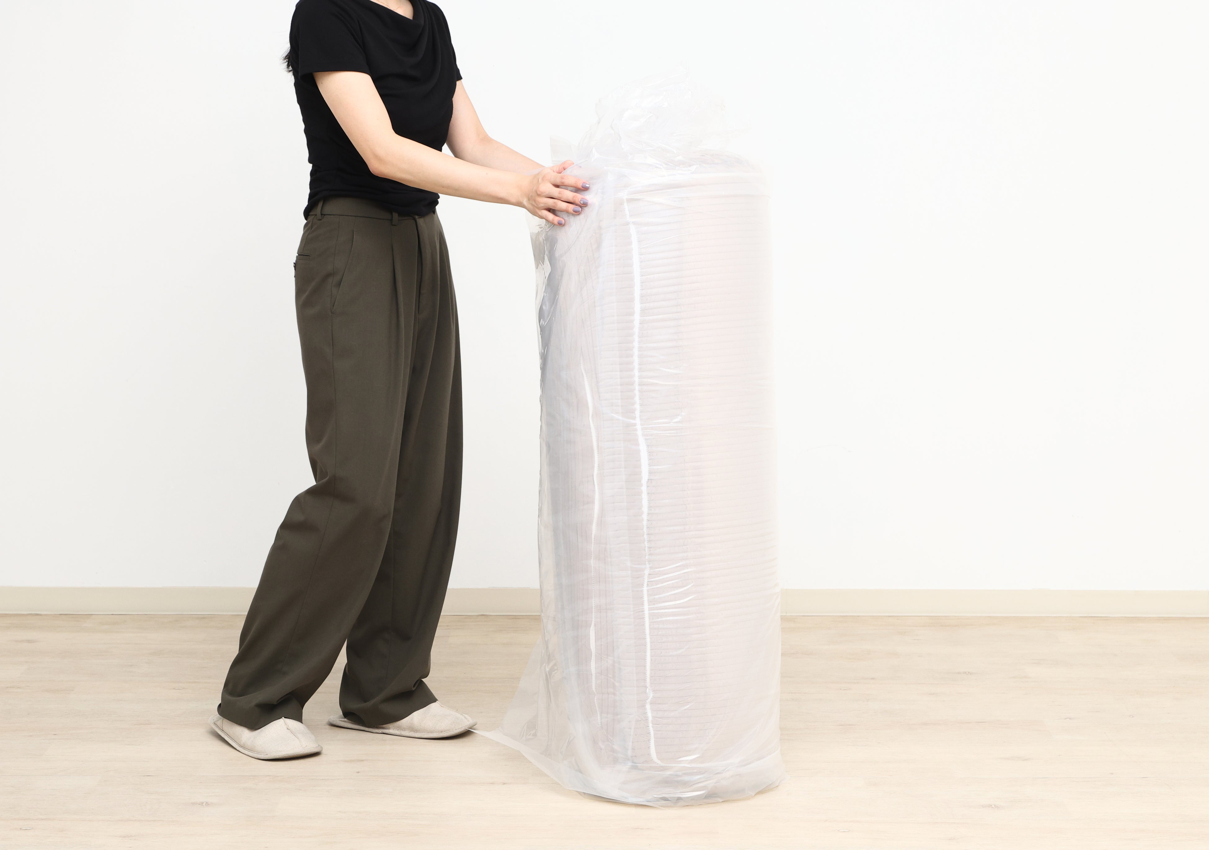 本製品はコンパクトな圧縮梱包でお届け。玄関もスムーズに通り、組み立ては袋を開けて圧縮をほどくだけなので1人でもOK(開梱から1時間で約95%まで復元します)。