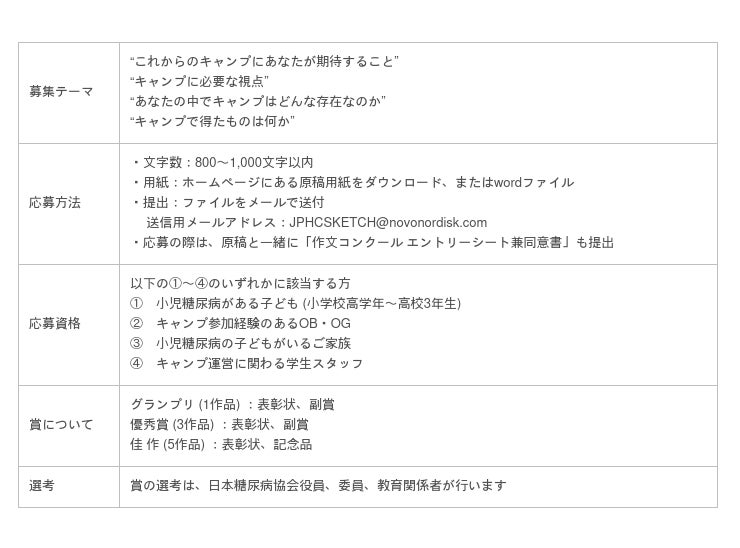「小児糖尿病キャンプ 2023年特別企画 スケッチ&作文コンクール」の実施概要詳細はウェブサイトをご確認ください。