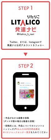 応募方法も簡単です。SNS(TwitterまたはInstagram)上で「発達ナビ」公式アカウントをフォローし、作品が分かる画像または動画を投稿してください。投稿文は作品についての説明と、2つのハッシュタグ「#みんなの2020作品展」と「#パナソニックセンター東京」を入れてください。