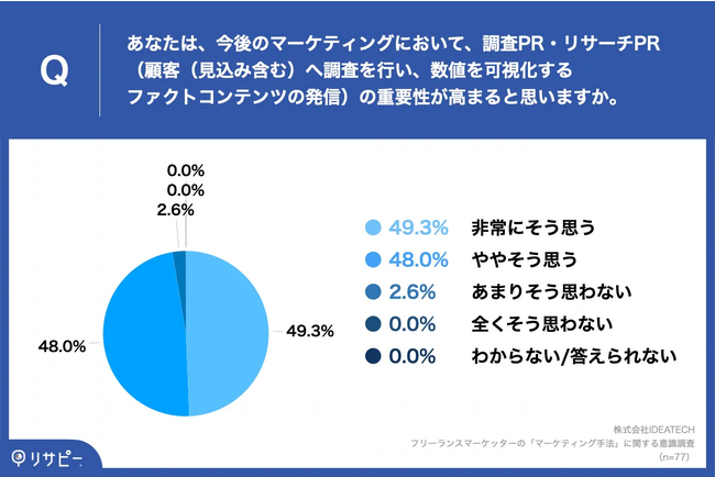 2. 法人様、フリーランスマーケッターの方々がお取引先の会社やサービスの価値を高めていく際の有効な一つの手段としてリサーチデータ・調査データをマーケティングに活用する「リサピー(R)?」を選んでいただくケースが増えてきています。実際に、フリーランスマーケッター100名を対象に実施した調査(※)において、8割のフリーランスマーケッターが、「クライアントに提案できるマーケティング手法をさらに増やしていきたい」意向を示しており、さらに97.5%が、今後のマーケティングにおいて、「調査PR・リサーチPRの重要性が高まる」と回答しています。このことから、マーケッターのみなさまがクライアント様のマーケティングを推進する武器としてお役立ちできると考えております。