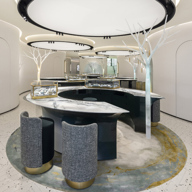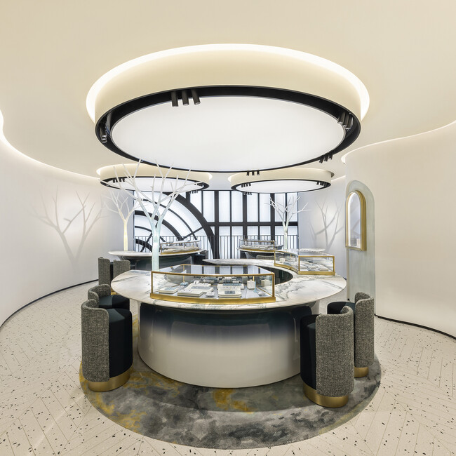 3階はブライダルのフロアです。優美な曲線を描くフロアで、カップルたちはエンゲージメントリング、そしてウェディングリングと出会います。フロアに配された白い樹木のオブジェは、日本人アーティストによるデザインスタジオYOY(ヨイ)が手掛け、願いや誓いを神社仏閣の神聖な木に結ぶという日本独自の風習からインスピレーションを受けたものです。白樺のようなこれらの樹木の造形は透明な幹や枝の表面にドレスを思わせるレース素材を覆う繊細な細工が施されています。