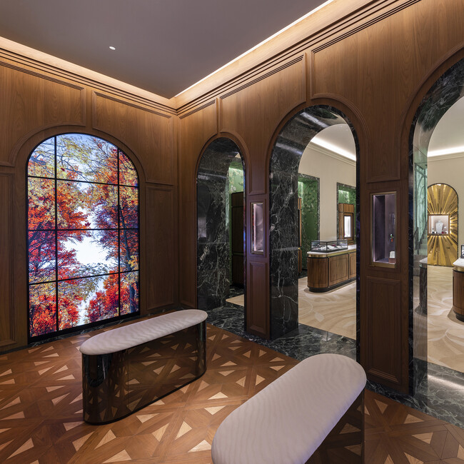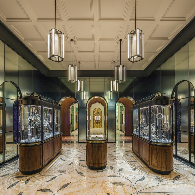 2階では、メゾンのほぼ全ての作品を見ること、そして試着することができます。このフロアは、ヴァンドーム広場本店内の一角にある「ジャルダン ディヴェール(冬の庭園)」のプライベートな雰囲気を再解釈し、豊かな自然環境の中に居心地の良いVIPのためのスペースがデザインされました。ランドスケープデザインを専門とする日本のスタジオ、TOHO LEO(東邦レオ)によるバックライトで照らされた壁と天井は、自然光のような柔らかな光を拡散させ、植物が生い茂る本物のガラス窓のような錯覚を生み出します。また日本の伝統工芸である陶磁器の花瓶には様々な植物がディスプレイされ、この特別な空間を完成させます。