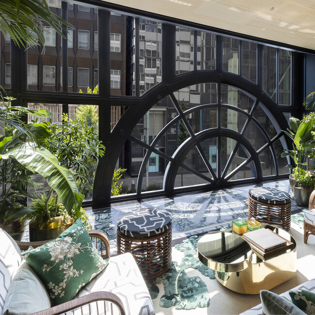 また、1階をさらに奥に進んでいくと、植物が描かれた壁面とカラーグラデーションガラスのミラーが現れ、ミラーによって広い空間を演出。シルクの壁紙はDe Gournay(ドゥ グルネイ)にオーダーメイドしたもので、生命を吹き込まれたようなアイビーが描かれています。壁を覆うミラーをデザインしたのは、オランダ人デザイナーの Sabine Marcelis(サビーヌ・マルセリス)氏です。「非常に正確な作業を可能にする工業的なプロセスで色彩を研究しています。光の屈折の仕方は、色の知覚に影響を与えます。私にとって、光による表現は常にプロジェクトの中心にあります。光による陰影のわずかな違いが、空間の捉え方を大きく変えることがあるのです」とサビーヌ・マルセリス氏は述べます。