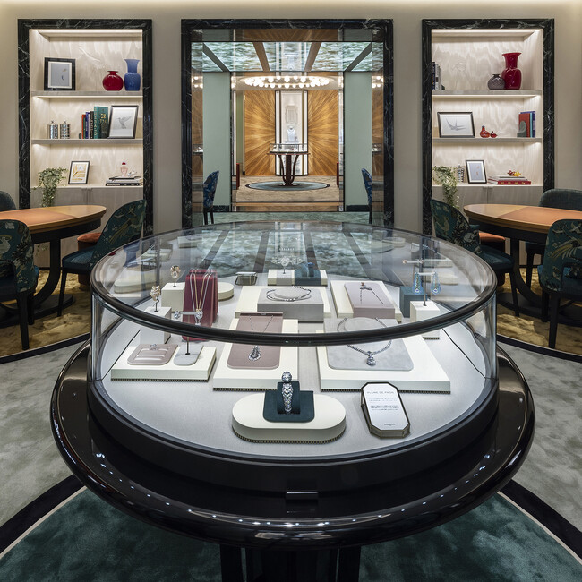 ブティックのオープン時には、スペースの形状を自在に変えることができるこのエリアで、メゾンの最新ハイジュエリーコレクションの「モア イズ モア」が特別展示されます。クリエイティブディレクターは、シンプルなフォルム、鮮やかな色彩、極端なスケールの要素をハイジュエリーに用いることで、他にはない、類まれなクリエイションを生み出しました。このコレクションには、ブシュロンのハイジュエリー制作に対する、「美しく貴重でありながら、ありきたりで退屈とは対極にあるもの」というビジョンが反映されています。