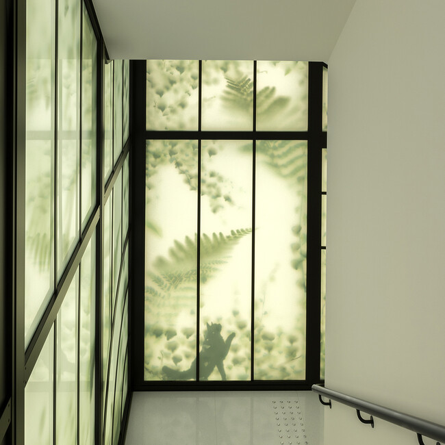 ブティックの各フロアをつなぐ階段の壁面には植物が生い茂り、自然への没入感をいっそう高めます。下層階から継続する景色のようにデザインされた、建物の上部へとつながる庭園。想像上の庭園でありながら、リアルな自然の風景に常に触れることができ、同時に光と音によっても自然を体験することを可能にします。また、この場所はメゾンのアイコニックな黒猫であるウラジミールにとっての遊び場でもあります。