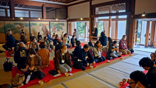 大方丈ではプラン参加のお客様に抹茶とお菓子がふるまわれました。一服を嗜みながら、方丈を飾る群鶴の紺碧障壁画(狩野尚信・画)と窓外の名勝庭園を楽しみました。小方丈の山号額は、この日だけレプリカではなく真筆の額が掲げられ、案内してくださったお坊様も「私も初めて拝見します。」と少し興奮気味に。