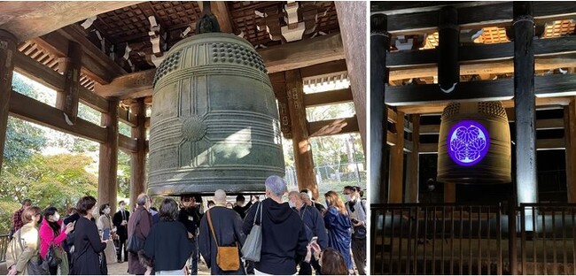撞けばその音は京都市中に響き渡るといわれる大鐘楼。重さ70トンほどもあり、「落ちないと分かっていても、真下に入ると少し怖いですね。」と苦笑するお客様もいらっしゃいました。ライトアップでは葵の御紋が映し出され迫力が増しました。