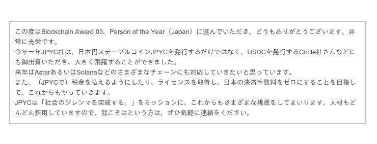 12月22日に発表された「Blockchain Award 03」において、JPYC社代表の岡部典孝が『Person of the Year(Japan)』部門のアワードを受賞いたしました。