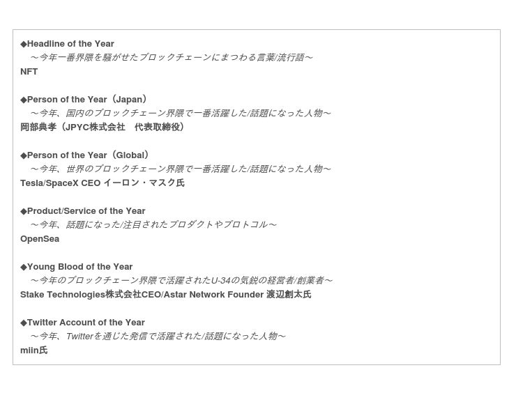 「Blockchain Award」は、2021年のブロックチェーン界隈を振り返り、話題になったニュースや活躍した人・企業を独自の基準で選出・表彰する賞で、今回が3回目の開催となります。選定に当たってはアワード選出の6部門に対して一般の方々からの投票が行われ、各部門の受賞が決定されました。