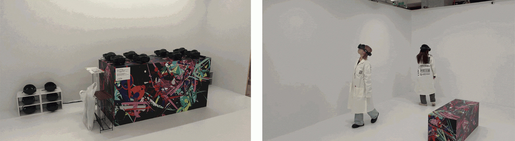 白い壁面の会場内をMR対応ヘッドセット「Meta Quest Pro」を通してみることで、現実世界と神椿市の世界の融合を楽しむことができます。