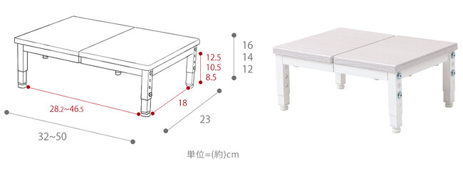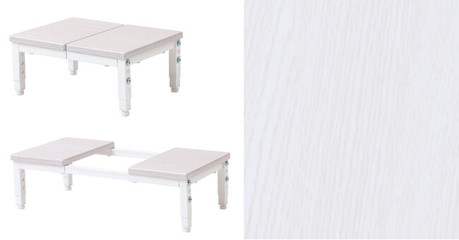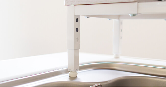 最小幅は32cmとコンパクトですが、天板を広げることで50cmまで拡張することが出来るので、シンクに渡して設置することも可能。また、脚の高さはそれぞれ3段階(約12cm・14cm・16cm)に調整が出来るので設置場所の段差にも対応しやすくなっています。