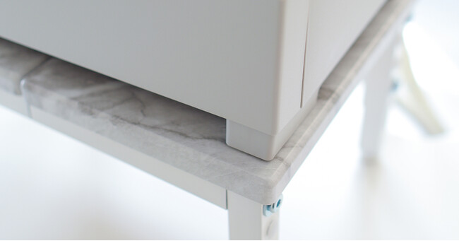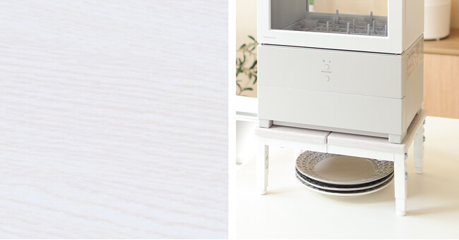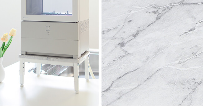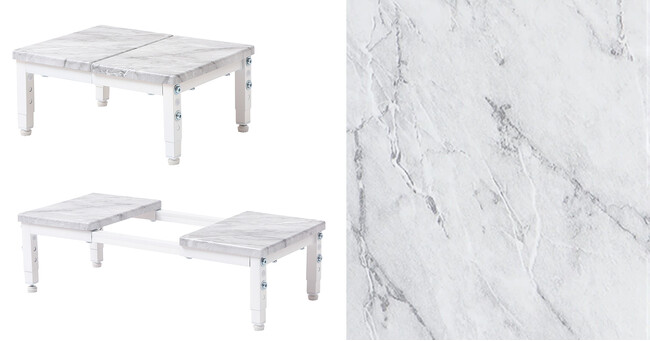 広がる天板には「大理石柄」と「木目柄」の2種が用意されています。本物に見間違えるような上質なPVCシートの天板は、水濡れにも強くお手入れが簡単です。