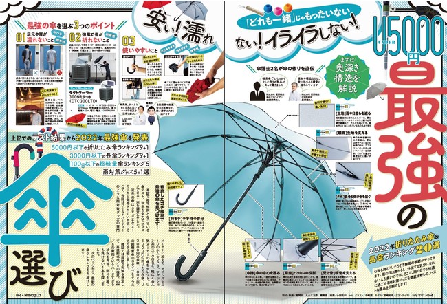 7月号は、暑さ・臭い・ベタベタなど季節のトラブルをサラッと解決してくれる「ホムセン&人気ショップ 指名買いTHE BEST 2022 SUMMER」を大特集! ベタついた頭皮と髪の毛をリフレッシュするクールシャンプー、汗も臭いも抑えてくれる制汗剤など、ホームセンターや人気ショップで買える季節対策グッズをご紹介。ほかにも、5000円以下で買える最強の折りたたみ傘&長傘ランキング20選や、コバエや蚊を撃退する害虫対策アイテムなど、今欲しい情報満載でお届けしています。本リリースでは、編集部が“本当におすすめできる”製品の一部をご紹介します。