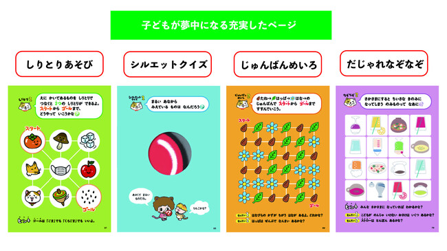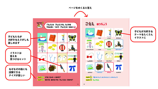 なぞなぞを楽しむだけでなく、かわいいイラストももりだくさん。1ページでいくつもの楽しみ方ができ、子どもたちを飽きさせません。遊びながら脳が鍛えられ、さまざまな答えがひらめきます。