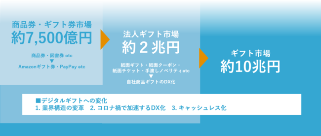 従来のギフト券はもちろん、キャッシュレス化・コロナ禍によって著しく進むDX化に伴う未来のギフト・マネーサービスにも随時対応、約7,500億円の金券市場を網羅していきます。
