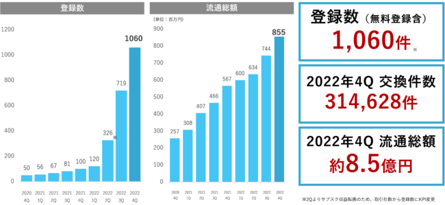 2022年度通期目標である登録数1,000件に向け、展示会を中心とした営業活動への投資、代理店契約の推進など、営業活動強化の動きを積極的に行った結果、第2四半期以降より登録数が大幅に増加、目標を達成することができました。登録数増加に伴い「デジタルギフト(R)」及び「デジタルウォレット」の流通総額、トランザクション数も増加し、2022年9月期第4四半期に過去最高となる8.5億円、30万件をそれぞれ突破することができました。今後は、ご登録いただいた1,000件超の登録者様に対して、継続的にご活用いただけるような提案を展開し、アカウント毎の利用率の向上と利用額の向上を目指してまいります。