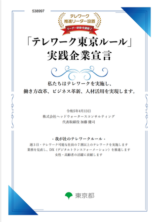 DXに関する構想・戦略策定から、施策検討・実施までを一気通貫で支援する株式会社ヘッドウォータースコンサルティング(本社:東京都新宿区、代表取締役:加藤 健司、以下「ヘッドウォータースコンサルティング」)は、このたび東京都が提唱する「テレワーク東京ルール」実践企業に認定されたことをお知らせいたします。