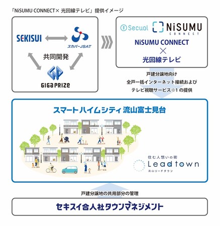 積水化学工業株式会社 住宅カンパニー(プレジデント:神吉利幸、以下「積水化学」)、株式会社ギガプライズ(代表取締役社長:佐藤寿洋、以下「ギガプライズ」)、スカパーJSAT株式会社(代表取締役執行役員社長:米倉英一、以下「スカパーJSAT」)、株式会社Secual(代表取締役CEO:菊池正和、以下「Secual」)は、戸建分譲地向け全戸一括インターネット接続およびテレビ視聴サービス※1「NiSUMU CONNECT(ニスム コネクト)×光回線テレビ」を開発し、積水化学が展開する大規模分譲地「流山リードタウン」内の戸建分譲街区「スマートハイムシティ流山富士見台」(以下「SHC流山富士見台」)で提供を開始します。