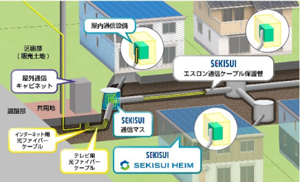 従来、戸建分譲地は屋外配線距離が長く全戸一括接続サービスには不向きとされていましたが、「NiSUMU CONNECT×光回線テレビ」では積水化学グループ製品の光ファイバーケーブル管路「エスロン通信ケーブル保護管」を利用し地中にケーブルを埋設するとともに、耐久性が高く、長距離でも信号損失が少ない光ファイバーケーブルを採用することで、戸建分譲地における全戸一括接続サービスを実現。災害に強く安全性・信頼性の高いレジリエンスな通信インフラを構築し、安定した通信環境を確保しました。