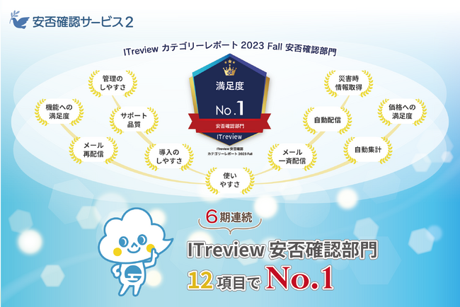 トヨクモ株式会社(本社:東京都品川区、代表取締役社長:山本 裕次、以下トヨクモ)が提供する「安否確認サービス2」が、「ITreview カテゴリーレポート」の安否確認部門にて、6期連続で顧客満足度No.1に選出されました。また、「使いやすさ」「機能への満足度」など合計12の部門においてNo.1評価を獲得したことをお知らせします。
