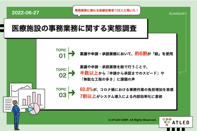 業務手続きの電子化(ワークフローシステム)大手の株式会社エイトレッド(本社:東京都渋谷区、代表取締役社長:岡本 康広 以下、エイトレッド)は、100床以上の病院に勤めており、勤務先の事務業務に携わっている医療従事者102名に対し、医療施設の事務業務に関する実態調査を実施いたしましたので、お知らせします。