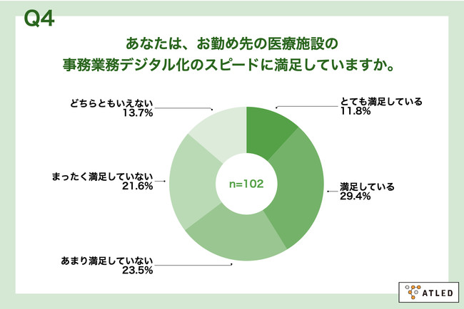 「Q4.あなたは、お勤め先の医療施設の事務業務デジタル化(紙や手作業で行っている業務をシステム化して効率化すること)のスピードに満足していますか。」(n=102)と質問したところ、「あまり満足していない」が23.5%、「まったく満足していない」が21.6%という回答となりました。