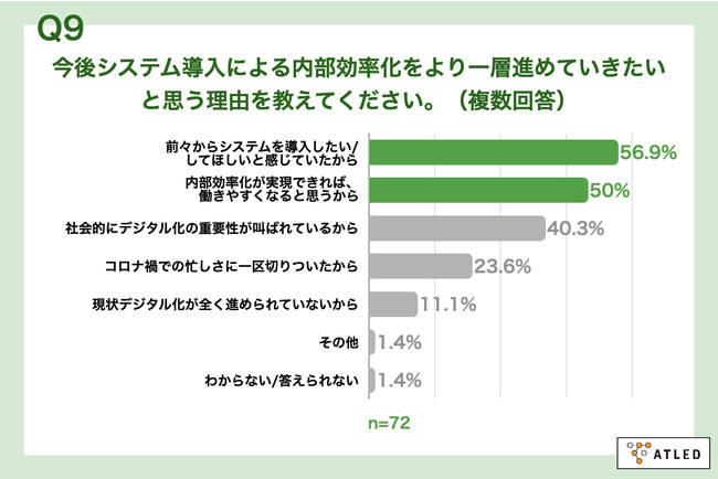 Q8で「非常にそう思う」「ややそう思う」と回答した方に、「Q9.今後システム導入による内部効率化をより一層進めていきたいと思う理由を教えてください。(複数回答)」(n=72)と質問したところ、「前々からシステムを導入したい/してほしいと感じていたから」が56.9%、「内部効率化が実現できれば、働きやすくなると思うから」が50.0%という回答となりました。