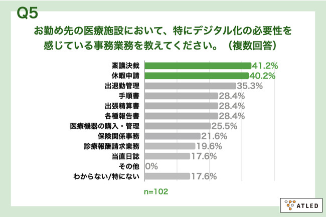 「Q5.お勤め先の医療施設において、特にデジタル化の必要性を感じている事務業務を教えてください。(複数回答)」(n=102)と質問したところ、「稟議決裁」が41.2%、「休暇申請」が40.2%という回答となりました。